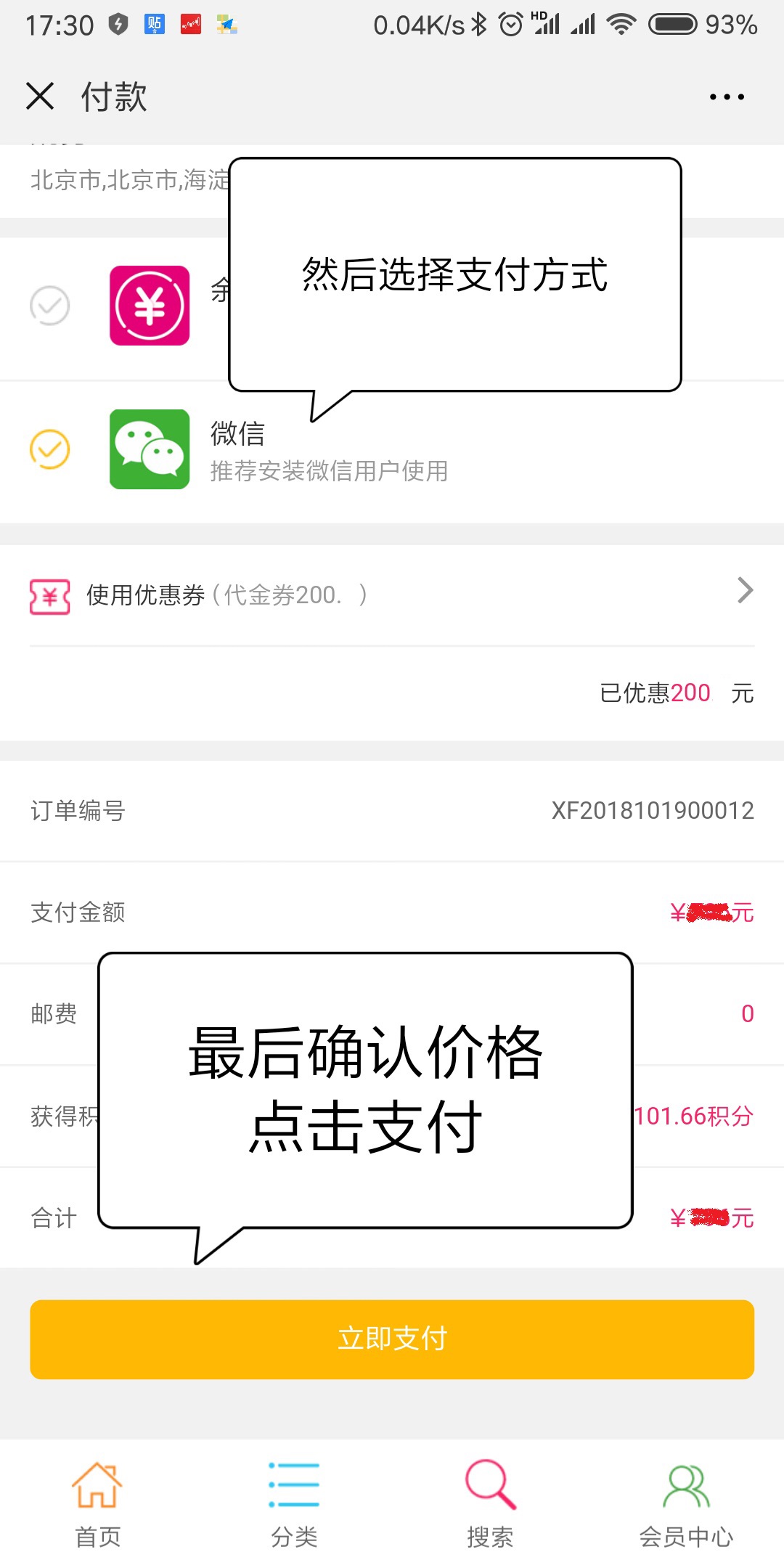第五步:選擇支付方式(使微信前的√對(duì)勾符號(hào)為黃色)